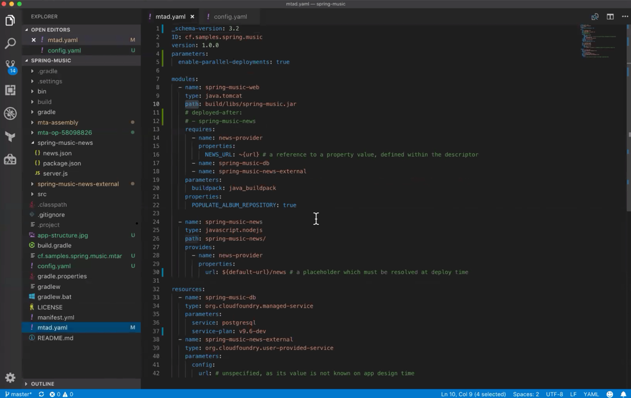 A YAML file with declarative descriptions for the Spring Music appWhile the benefits of the MultiApps CF CLI plugin weren’t clearly visible during the demo, Nikolay emphasized that performance improvements would be much more drastic with applications modeled for the tool.