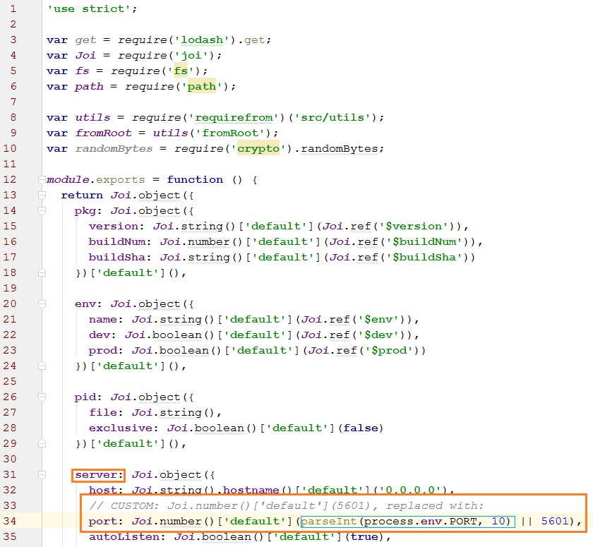 Normally, you should set the port in the ./config/kibana.yml configuration file before starting Kibana. If it is not set, port 5601 is used by default. Because we are going to run Kibana in Bluemix that assigns a random available port to an application during deployment, specifying the port value in the Kibana configuration becomes problematic. We just can’t know the port number in advance.