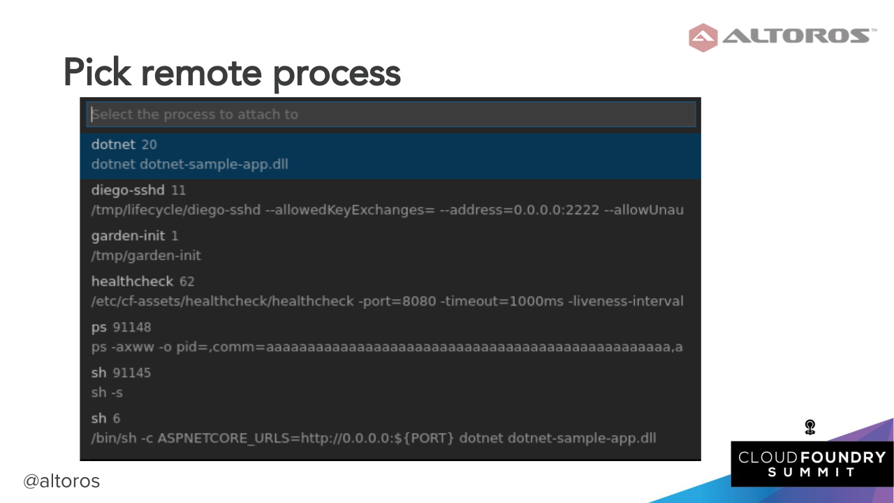 On pushing the app, we can finally choose a process we want to debug. To initiate remote debugging on Windows, you deploy a “debugger” virtual machine in Cloud Foundry’s internal network and employ the Remote Desktop Protocol to connect to a Diego cell and attach the debugger to a running process.